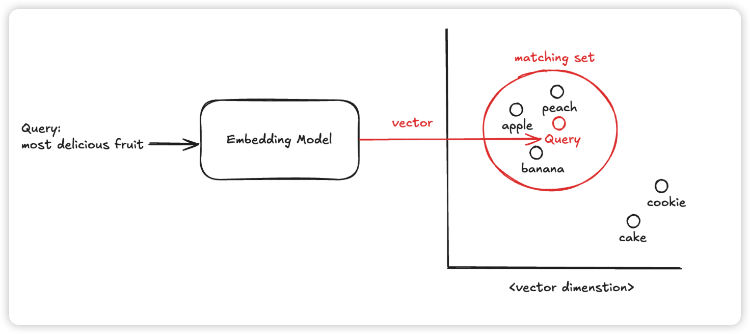 예를 들어, 검색어로 most delicious fruit 을 검색한다면, 같은 임베딩 모델을 거친 apple, banana, peach가 유사한 의미로 벡터 공간상에 위치하게 된다.