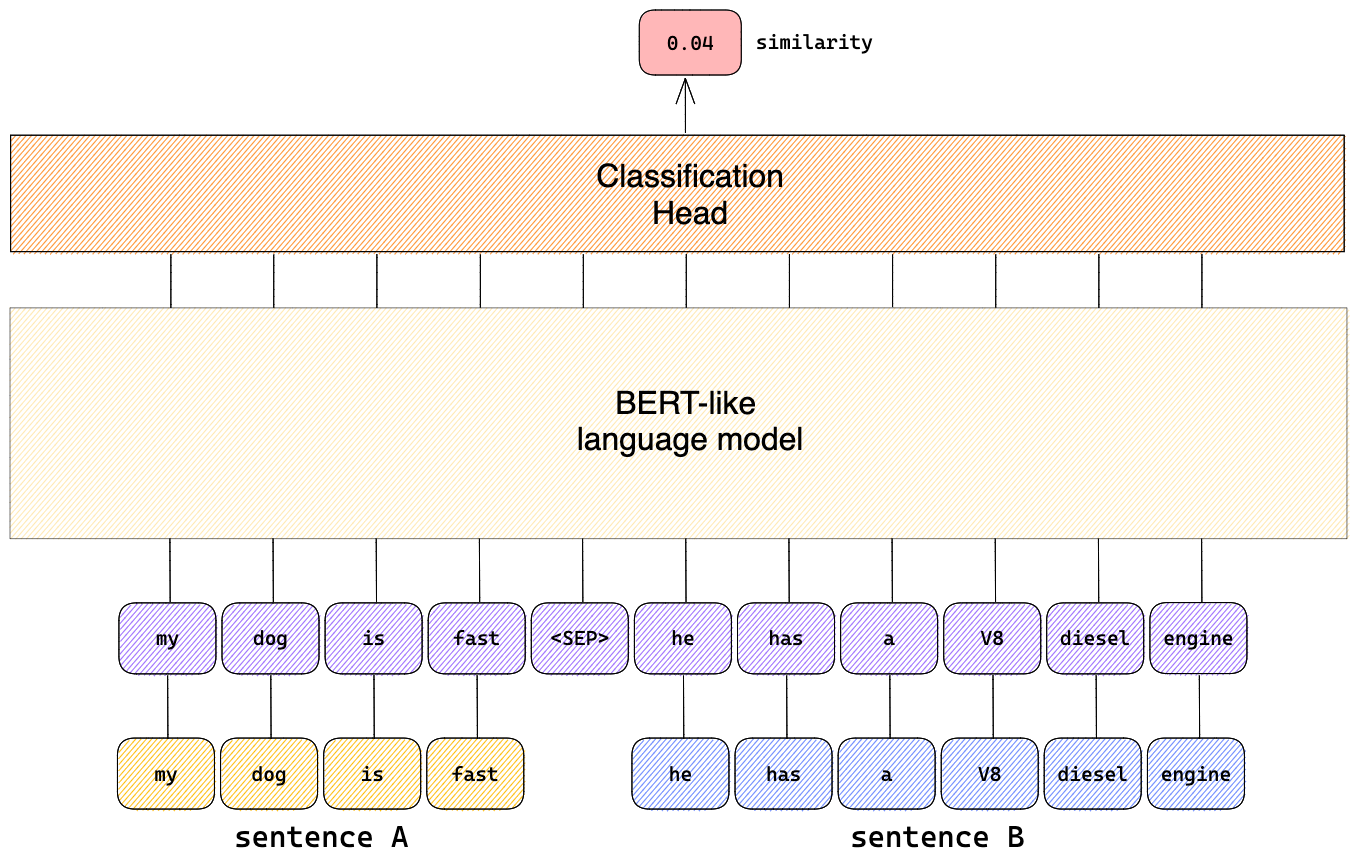 해당 모델은, bi-encoder 기반의 embedding 모델과는 달리, 두 자연어를 input으로 넣어 output으로 자연어간 유사도를 점수로 출력한다.