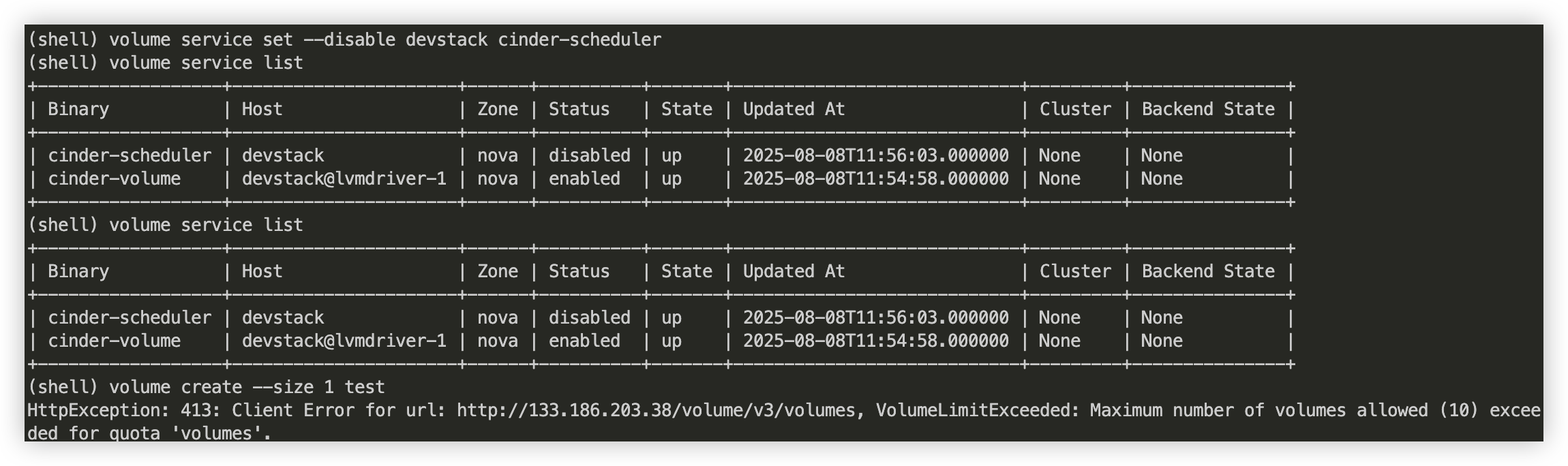 openstack volume service set --disable <host> <service>